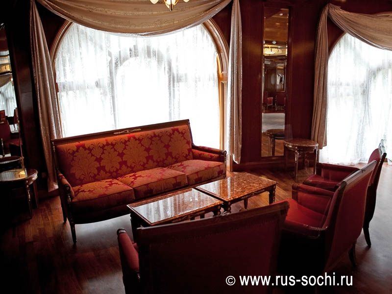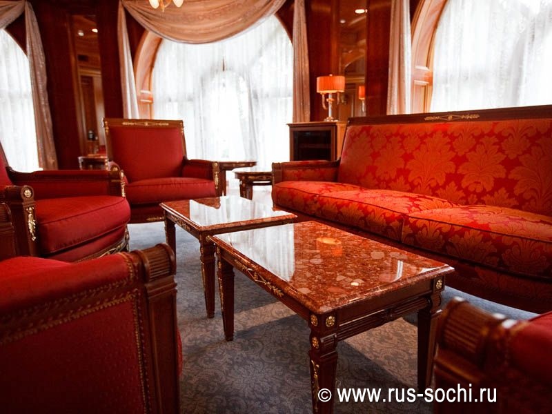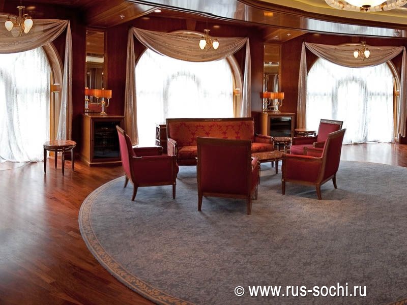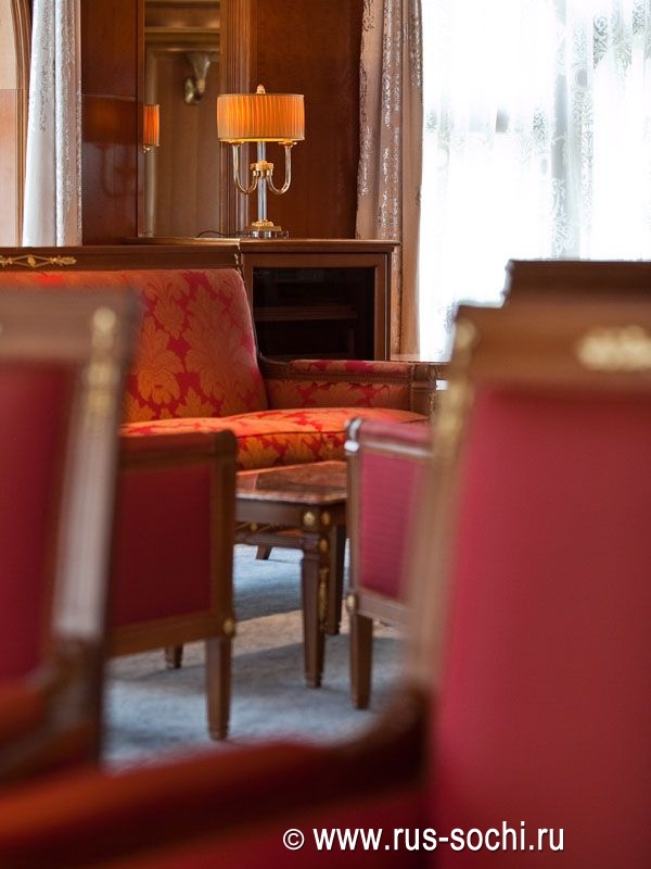 Просторное помещение с витражными окнами, уютными креслами за журнальными столиками идеально подходит для двусторонних встреч и переговоров в узком кругу.