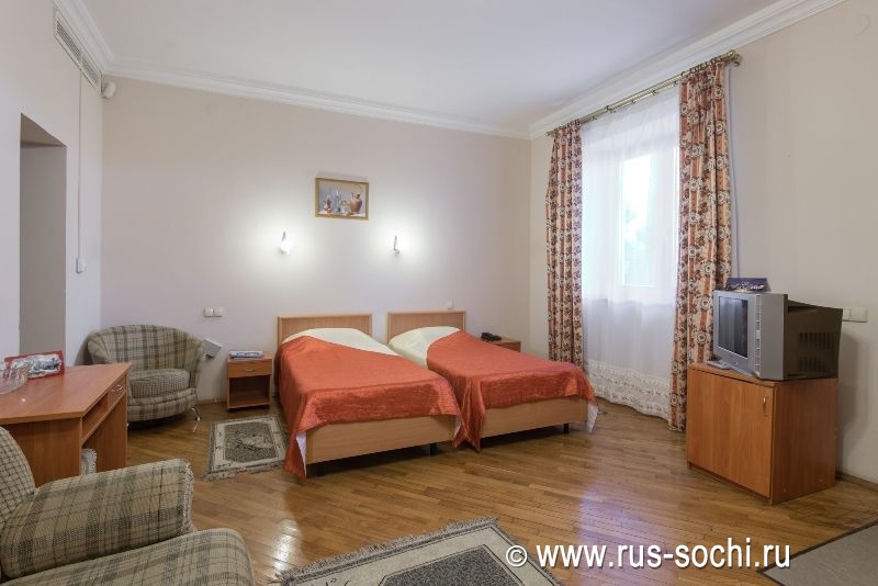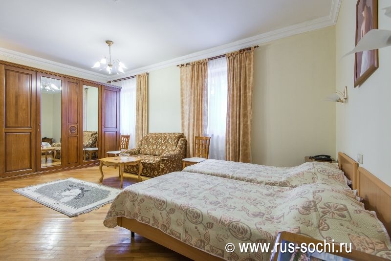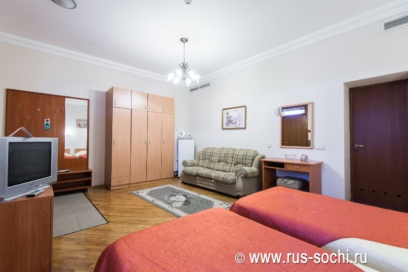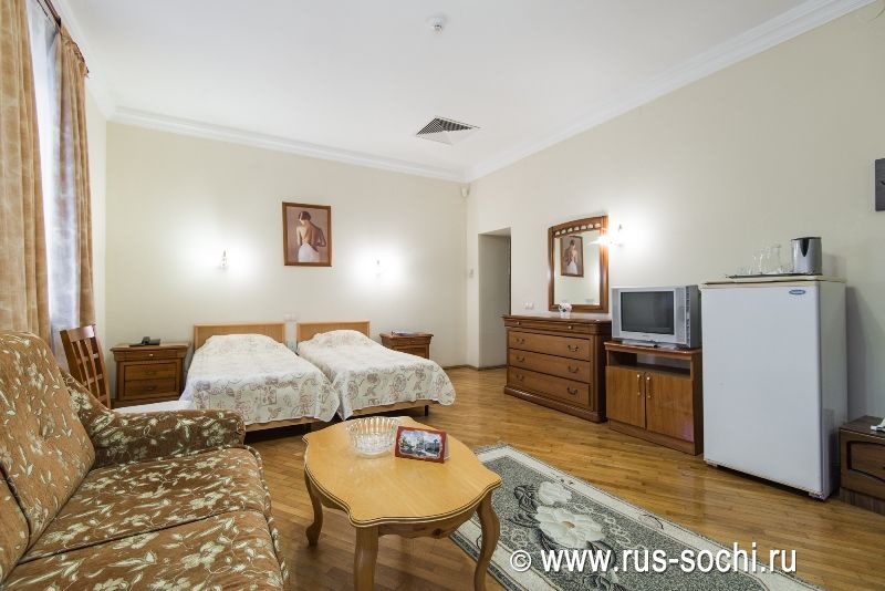 Оригинальное пространственное и дизайнерское решение интерьера. Номер оборудован двуспальной или двумя односпальными кроватями, диваном, красивой и удобной мебелью, холодильником, телевизором, телефоном. В ванной комнате - современная сантехника, фен, банные принадлежности