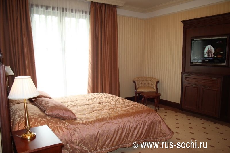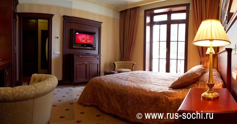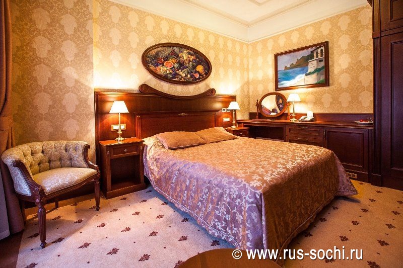 Особую прелесть в интерьере создает легкий текстиль в светлых тонах, а приятное ненавязчивое освещение делает номер еще более уютным.