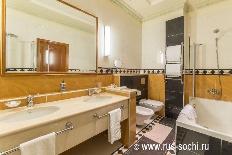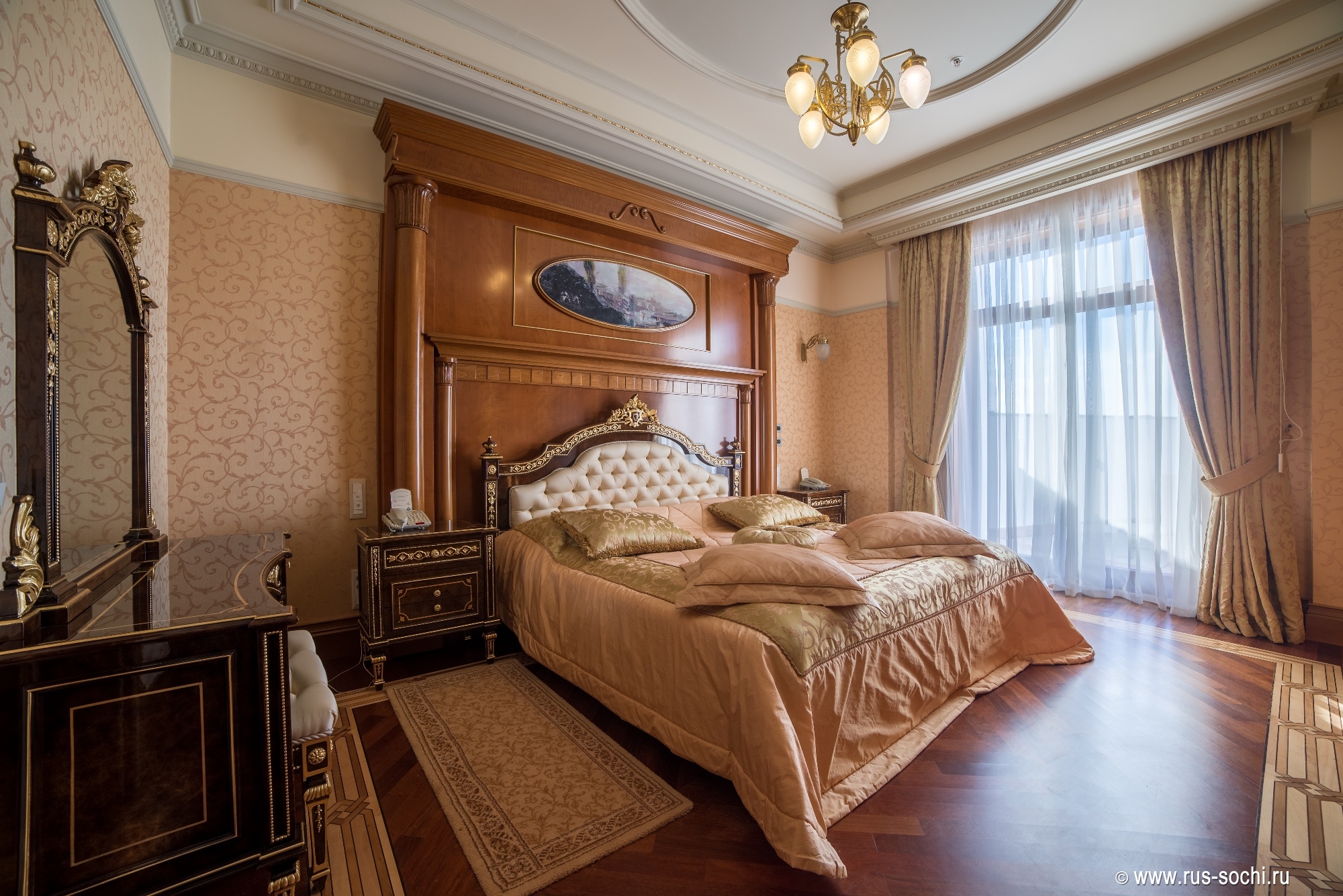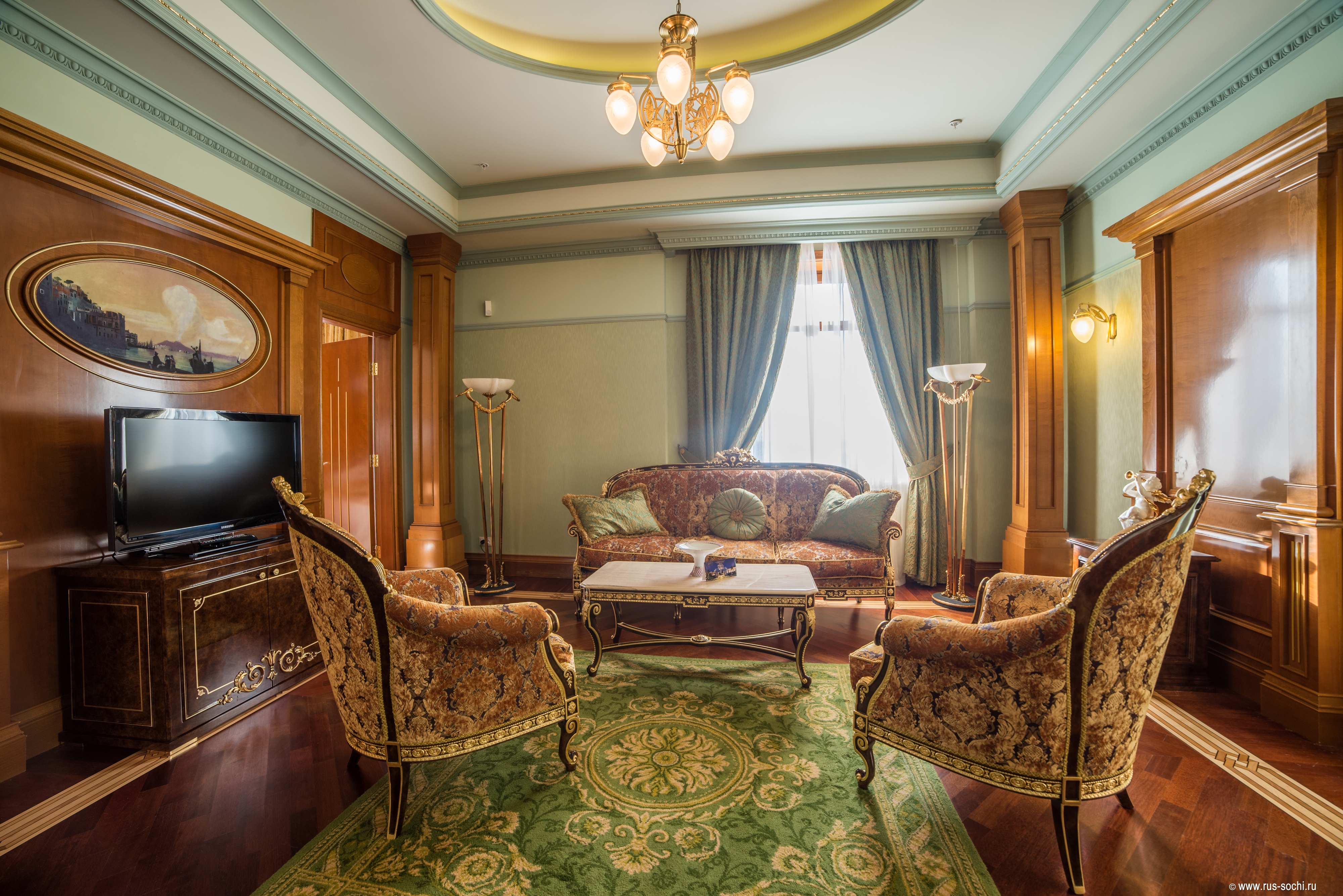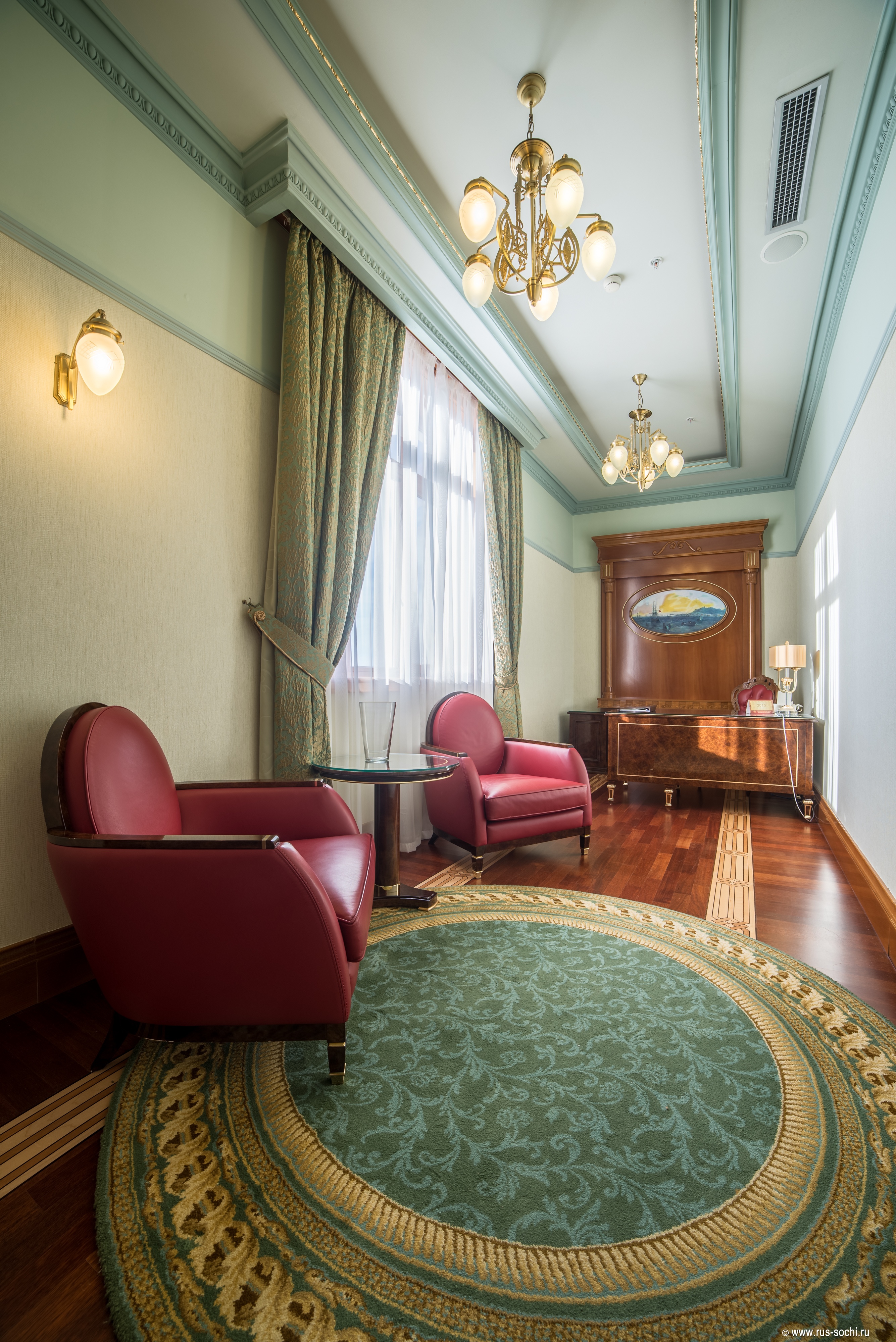 Функционально номер разделен на несколько зон: роскошную спальню с ванной комнатой, элегантную гостиную, отдельный рабочий кабинет, кухню, просторную гардеробную и большую террасу с потрясающим видом на море и горы. Особую прелесть в интерьер номера вносит необычайно гармоничное сочетание изысканной мебели, мягких бронзовых переливов великолепного текстиля Trevira, позолоченных светильников и оригинальной отделки каждой из комнат. Настроиться на рабочий лад поможет прекрасно оборудованный кабинет, в котором можно с успехом провести деловые переговоры или обсудить с партнерами текущие дела в режиме on-line по интернету.