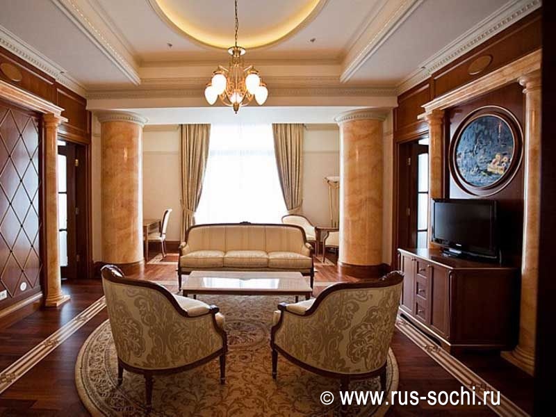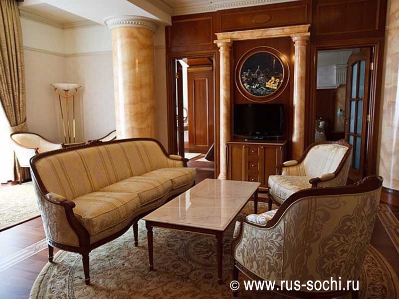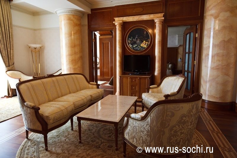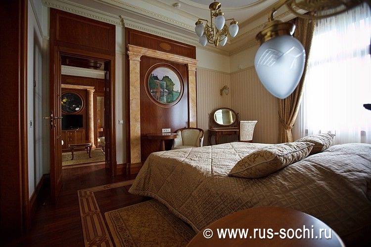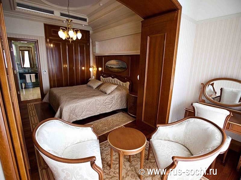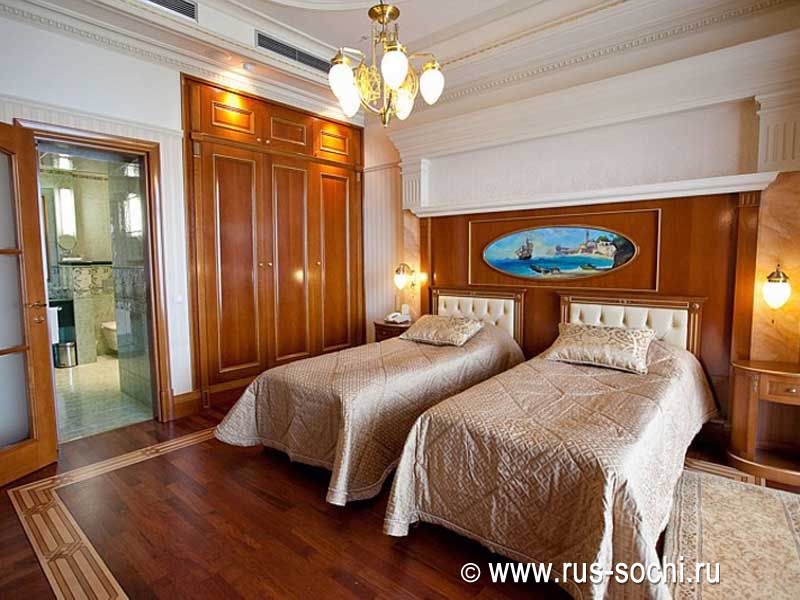 Номер состоит из двух спальных комнат, с французской кроватью и двумя односпальными кроватями, двух ванных комнат, оборудованных душевыми кабинами и ванной, и небольшой кухни. Гостей, предпочитающих душевный и физический комфорт, порадуют прекрасное постельное белье, удобная и элегантная мебель, теплые полутона великолепного текстиля и бра, струящие мягкий свет на холсты с изображением итальянских улочек и мостов. Ценителям высоких технологий будет приятно и здесь почувствовать себя на гребне волны: LCD-телевизоры последнего поколения, климат-контроль и современные системы безопасности, WiFi и другие технологические новшества позволят им чувствовать себя, как дома.