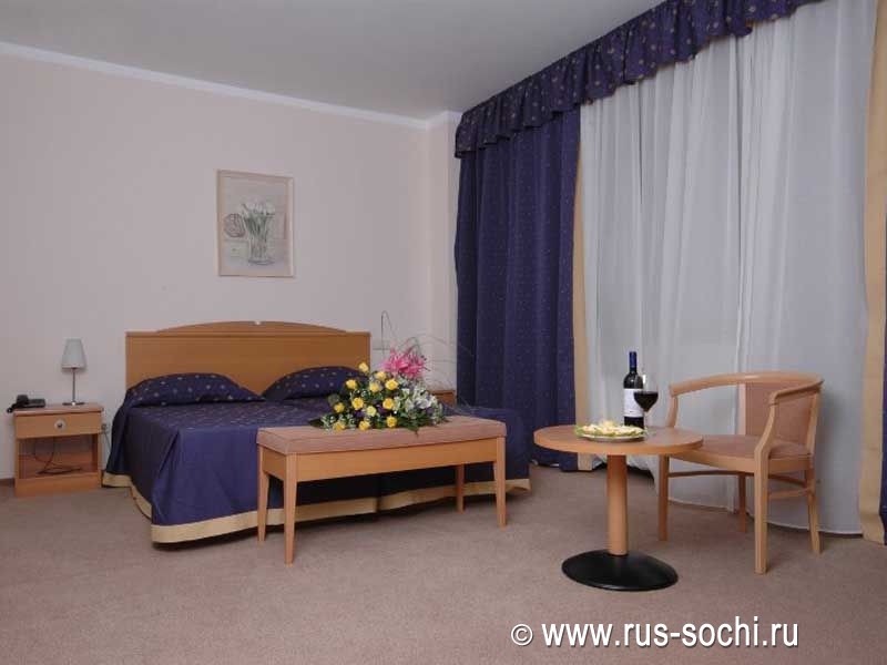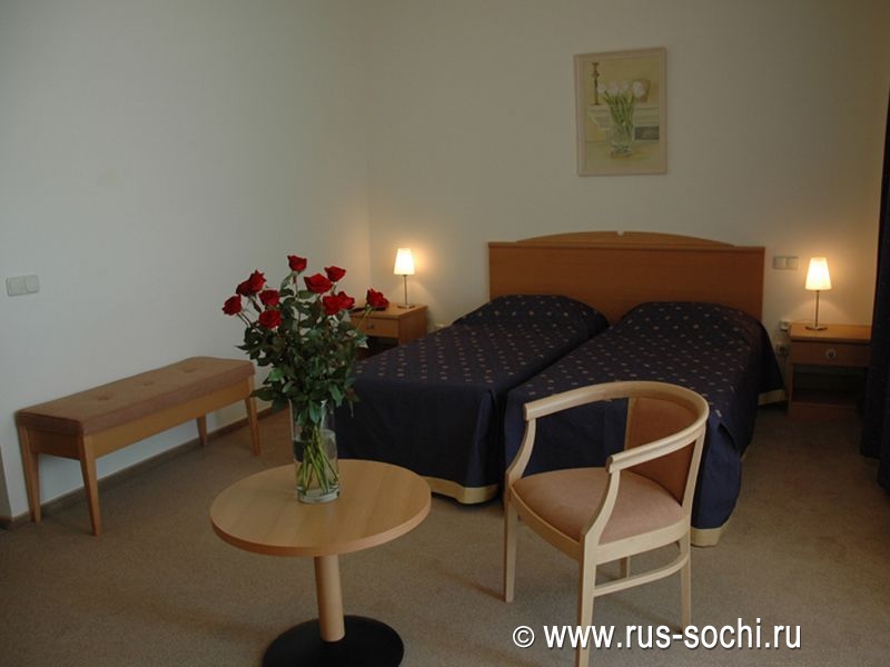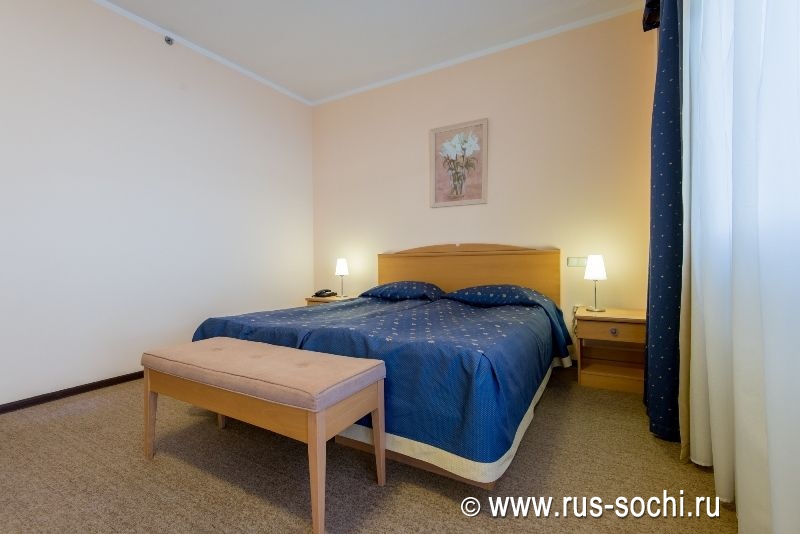 Оснащение номера: двуспальная кровать, легко трансформируемая в две односпальные, две прикроватные тумбы, косметический столик, банкетка, телевизор, холодильник-минибар, телефон, раздвижное кресло-кровать, журнальный столик.