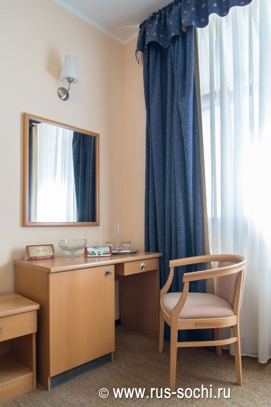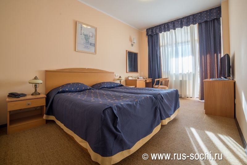 Оснащение номера: двуспальная кровать, легко трансформируемая в две односпальные, две прикроватные тумбы, косметический столик, телевизор, холодильник-минибар, телефон, кресло.